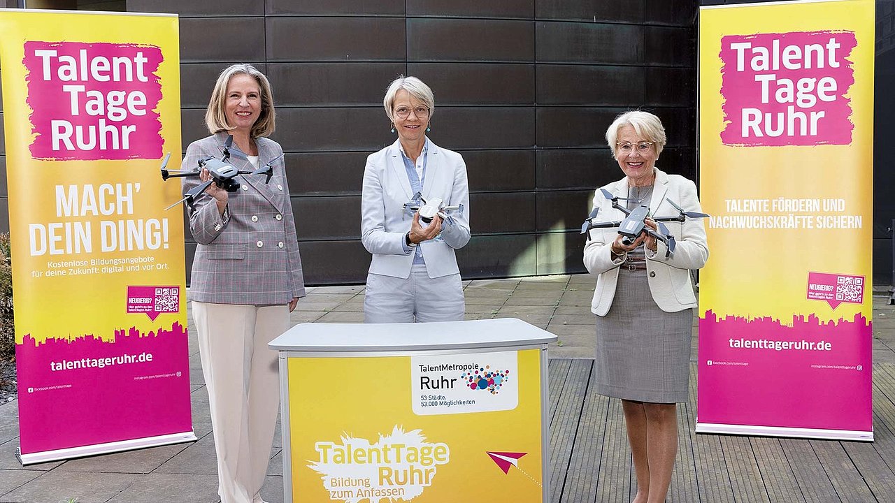 Zum Auftakt trafen sich die nordrhein-westfälische Schul- und Bildungsministerin Dorothee Feller, Bärbel Bergerhoff-Wodopia, Mitglied des Vorstandes der RAG-Stiftung und Bildungsbeauftragte des Initiativkreises Ruhr, und Dr. Britta L. Schröder, Geschäftsführerin der Stiftung TalentMetropole Ruhr, um sich über die bundesweit einzigartige Veranstaltungsreihe auszutauschen. Die Ministerin erhielt einen Einblick in die Programmvielfalt der Bildungsreihe, zu der auch ein Drohnenworkshop zählt.