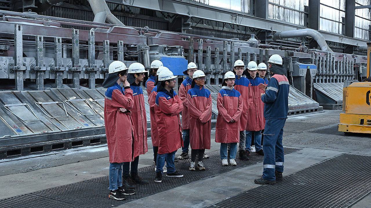 Rund 40 Oberstufenschüler:innen der Theodor-König-Gesamtschule Duisburg und dem Neuen Gymnasium Bochum bekamen eine spannende Werksführung durch die Aluminiumproduktion im Werk Essen. Mitarbeiter:innen erklärten die verschiedenen Arbeitsbereiche und beantworteten alle Fragen zur Produktion.
