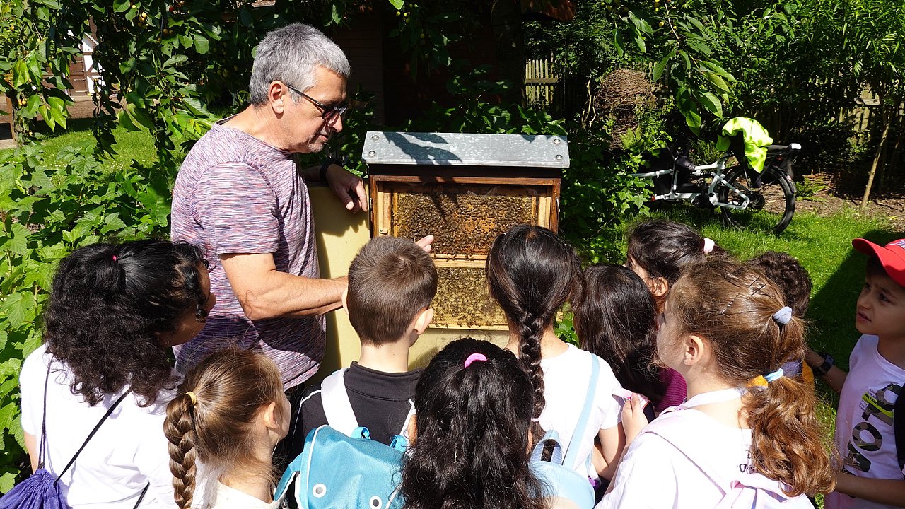 Am 08.06.2024 besuchten 26 Kinder der Internationalen KinderAkademie im Rahmen ihres Schwerpunkts Wissenschaft in zwei Gruppen den Bienenzuchtverein im Kaisergarten und das Tiergehege. In einer spannenden Darstellung wurden sehr anschaulich die unglaublichen Fähigkeiten und Eigenschaften einer Honigbiene erklärt, ihre jeweiligen Aufgaben in den bis zu 60.000 Bienen umfassenden Bienenvölkern sowie die besondere Bedeutung der Bienenkönigin. Dabei durften die kleinen Besucher einen Blick in einen von Bienen wimmelnden Bienenstock werfen, und mutige Jungen und Mädchen konnten sogar die männlichen Bienen, die sogenannten Drohnen, streicheln. Diese Mutprobe war zum Glück ganz ungefährlich, da Drohnen keinen Stachel haben.
