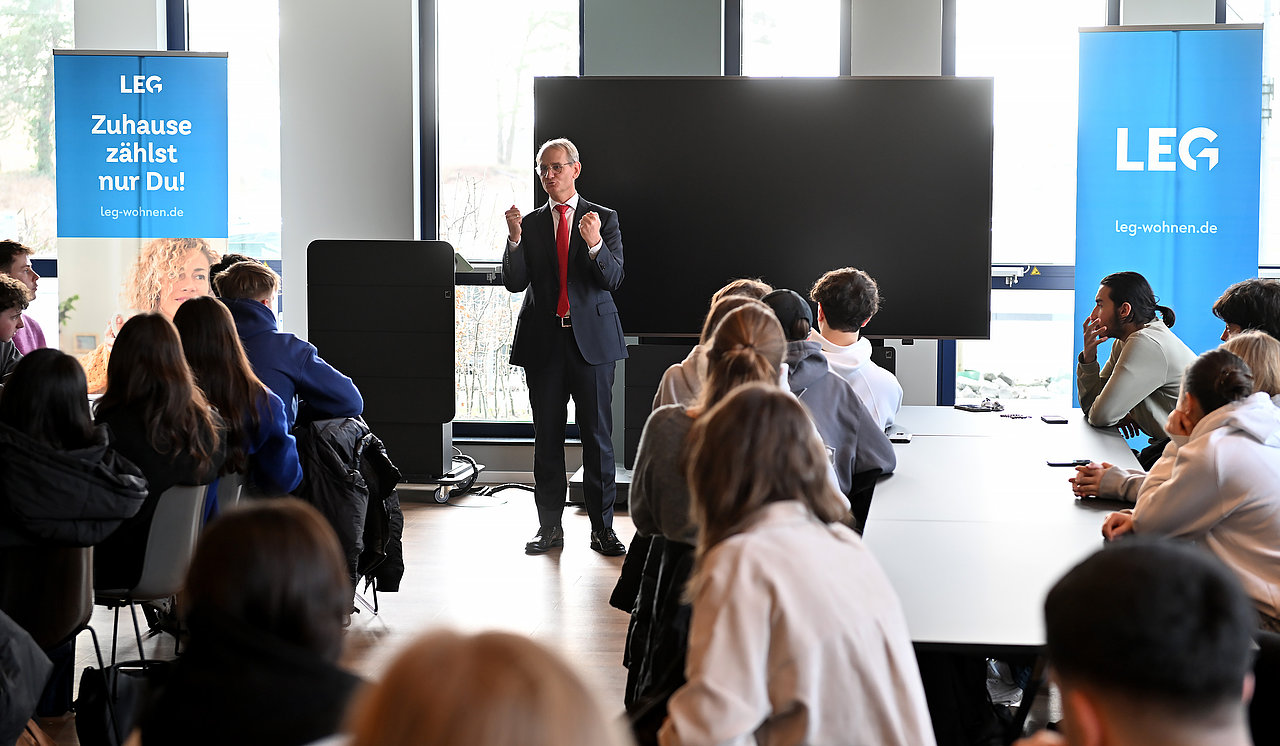 32 Schüler:innen hatten die Möglichkeit, im Rahmen des Projekts Dialog mit der Jugend die LEG Immobilien SE in Düsseldorf zu besuchen und ihre Fragen direkt an den Vorstandsvorsitzenden, Lars von Lackum, zu richten. Die LEG Immobilien SE zählt mit rund 167.000 Mietwohnungen und etwa 500.000 Bewohner:innen zu den führenden Wohnungsunternehmen in Deutschland.