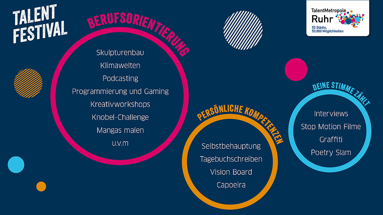 Das Festival- und Bühnenprogramm wurde gemeinsam mit knapp 20 Jugendlichen aus der TalentCommunity geplant. Informationen zum TalentFestival wurden an dieser Stelle immer wieder aktualisiert.