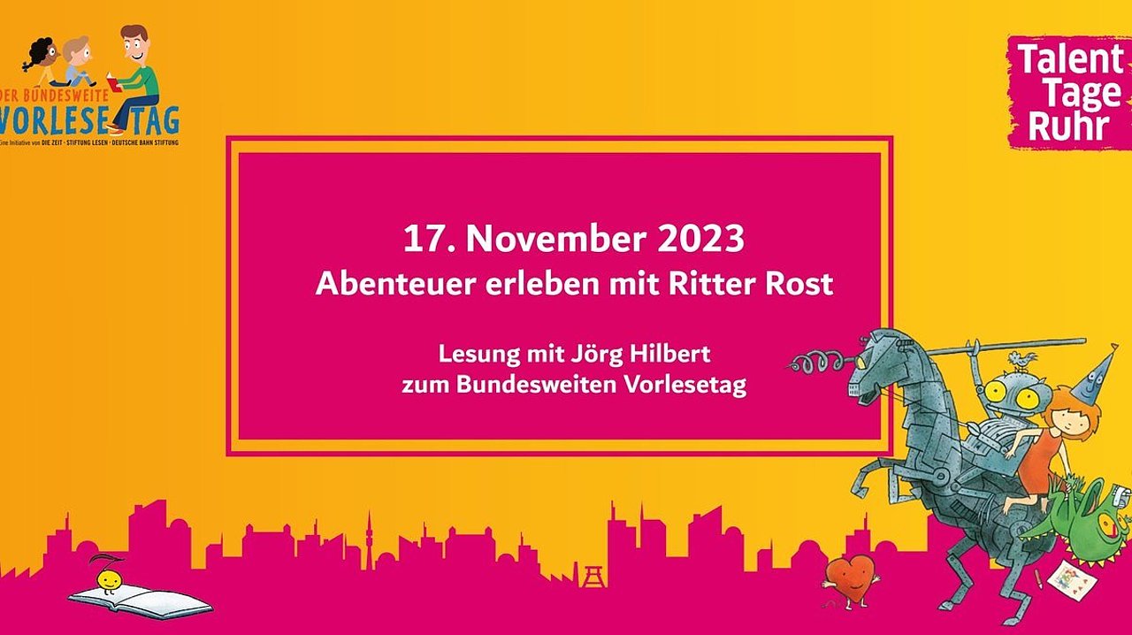 Am Freitag, den 17. November 2023 findet der bundesweite Vorlesetag statt und wir machen mit! Jörg Hilbert, Kinderbuchautor und -Illustrator von Ritter Rost, ist im Rahmen der TalentTage Ruhr unterwegs und hält zwei Lesungen in Gelsenkirchen-Ückendorf. Das kostenfreie Angebot richtet sich an Kitas und Schulen im Stadtteil. Im Anschluss wird in einer altersgerechten, interaktiven Gesprächsrunde der Bogen zum Thema Talentförderung gespannt.