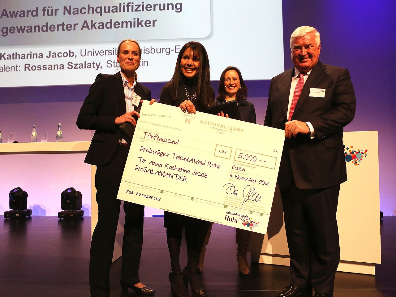 Anna Katharina Jacob, 39, engagiert sich in besonderer Weise, damit talentierte Einwander:innen den Weg zurück an die Hochschule sowie später zu einem ausbildungsadäquaten Arbeitsplatz finden: Sie leitet das Projekt ProSALAMANDER, ein Nachqualifizierungsprogramm für ausländische Akademiker:innen an der Universität Duisburg-Essen, das von der Mercator Stiftung gefördert wird. Sie weiß, wie misstrauisch die deutsche Wirtschaft und deutsche Hochschulen und auch deutsche Universitäten fremden Universitäts-Diplomen gegenüber sind. Mit der Folge, dass die Talente vieler hochqualifizierter Zuwander:innen verschüttet würden und dem Arbeitsmarkt verloren gingen. Ziel von ProSALAMANDER ist es, die bisher ungenutzten Potenziale zugewanderter Akademiker:innen zu nutzen, sie zur Aufnahme eines erneuten Studiums zu motivieren und ihnen zu helfen, dies erfolgreich abzuschließen – auch durch eine finanzielle Unterstützung. Die Stipendiat:innen erhalten bis zu 800 Euro pro Monat. Im Wintersemester 2013/14 haben 40 Stipendiat:innen ein Studium begonnen. Beworben hatten sich 144 Kandidat:innen. In der Regel können die Stipendiat:innen den deutschen Bachelor- oder Masterabschluss nach zwölf bis 18 Monaten erwerben.