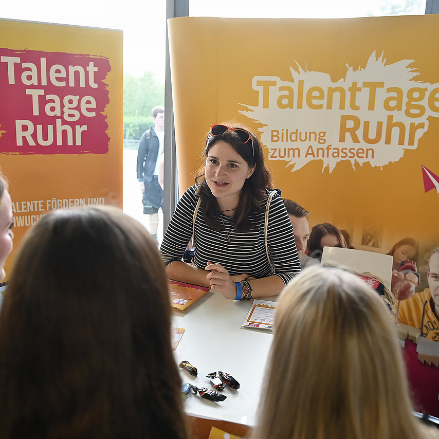 Bei der TalentMesse Ruhr für Ausbildung & Studium tauschen sich Schüler:innen aller Schulformen ab der 9. Klasse im Rahmen der TalentTage Ruhr mit Unternehmen, Hochschulen und Institutionen rund um das Thema Berufswahl aus. Aussteller:innen aus dem Ruhrgebiet informieren über ihre aktuellen Ausbildungsplätze, Studiengänge und Förderangebote und zeigen an praktischen Beispielen, wie ein Arbeits- bzw. Studienalltag aussehen kann. Die Schüler:innen werden durch eigens entwickelte Materialien vorbereitet, um sich einen individuellen Fahrplan für den Besuch der Messe zu erstellen.